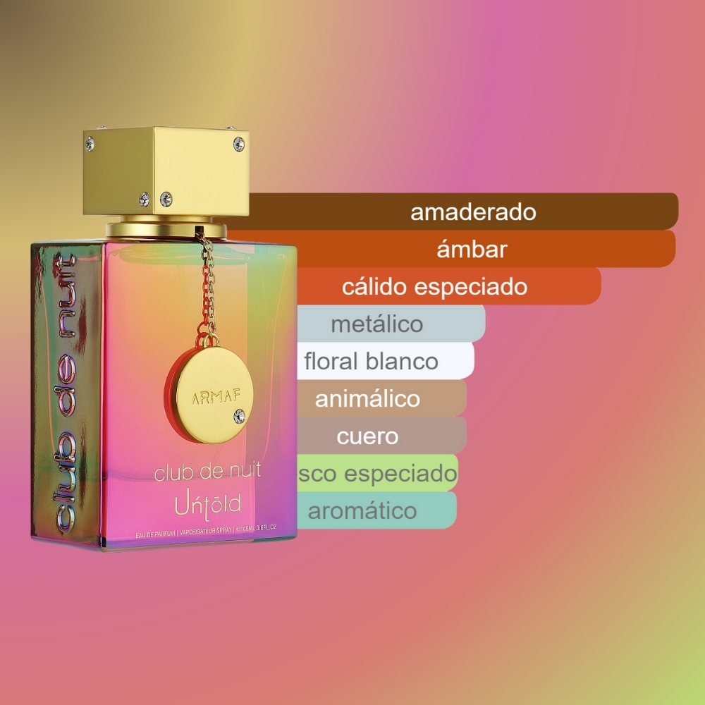 Club de Nuit Untold un perfume unisex que combina elegancia y sofisticación con una estructura amaderada y cálida. En primer plano, la calidez especiada del azafrán se entrelaza con el delicado aroma floral del jazmín. A medida que la fragancia se despliega, la madera de ámbar aporta una suavidad aterciopelada, mientras que el ámbar gris añade un toque de exotismo, envolviendo a quien la lleva en un velo de calidez y sensualidad. Finalmente, la resina de abeto infunde la fragancia con un toque de frescura terrosa, mientras que el cedro aporta una elegancia amaderada que perdura en la piel. Juntas, estas notas de fondo anclan la composición, dejando una huella duradera, atemporal e inolvidable.