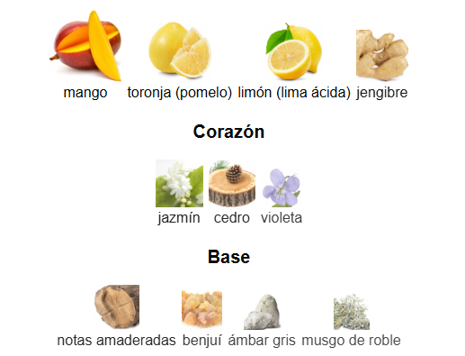 Notas de Salida: mango, toronja (pomelo), limón (lima ácida) y jengibre.