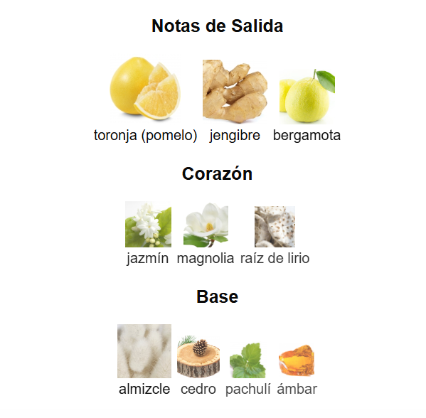 Notas de salida: pomelo, bergamota, jengibre.