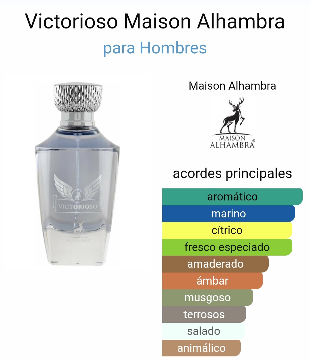 Victorioso de Maison Alhambra es una fragancia de la familia olfativa amaderada acuática para hombres. Victorioso se lanzó en 2022. Dupe de Invictus EDT de Paco Rabanne